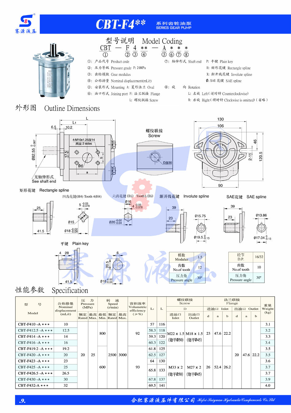 产品安装、使用注意事项 一、工作介质 1、推荐夏季选用L-HM46或相近粘度的液压油,冬季选用L-HM32或相近粘度的液压油。 2、工作油温范围-20—80。 3、系统清洁度直接影响液压元件的可靠性,加油前,油箱、管路应充分清洗, 一般泵吸入侧常用过滤精度100目的滤 油器(其额定通流量应不小于泵流量的两倍),回油管路接过滤精度不低于25um的滤油器。 二、齿轮油泵 1、油泵启动前应仔细检查进出油口、旋转方向是否与标牌指示方向一致,切勿逆向旋转。 2、泵传动轴与原动机输出轴之间应采用挠性联轴节联接,其不同轴度不大于0.1mm。 3、应保证泵轴不承受径向力、轴向力和弯矩。安装齿轮泵时,轴应缓慢导入,切勿强行敲打,轴向碰撞,否则将对泵 造成严重损坏。 4、泵的吸油高度不大于0.5m。 5、进油口连接法兰处严禁磕碰。结合面、接头必须严格密封,以防漏气,否则会引起噪声、振动、产生泡沫等异常现 象,降低齿轮泵寿命。 6、齿轮泵吸油管的通径应保证油的流速小于1.5m/s。